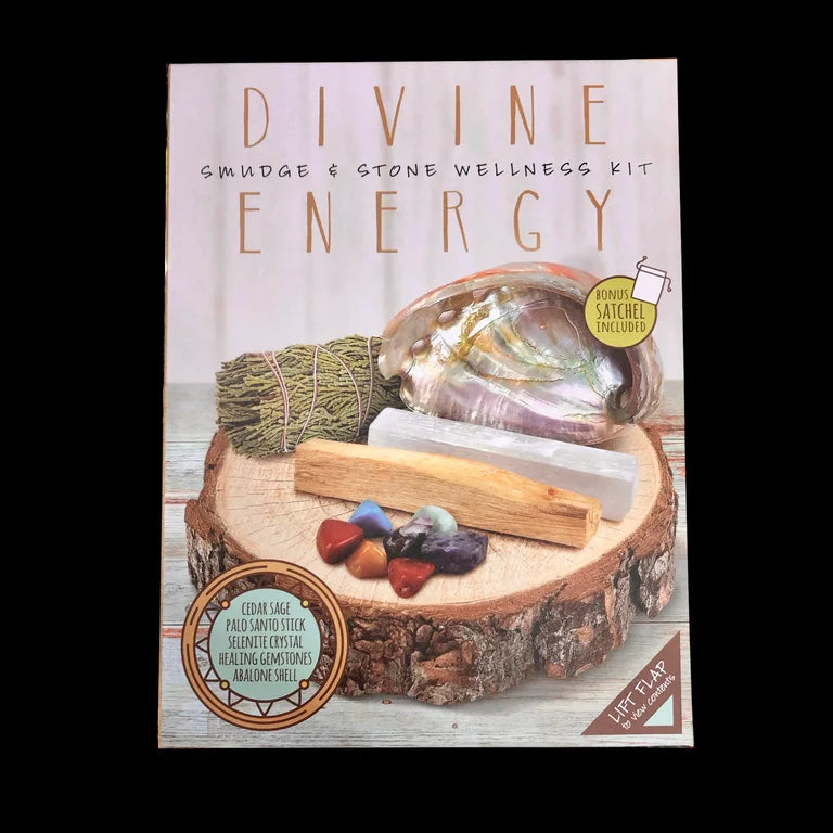 Divine energy smudge and stone wellness kit. This kit includes cedar sage, palo santo, selenite, seven stones, abalone shell, and a pouch!